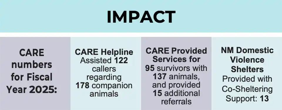 CARE assists New Mexico’s domestic violence shelters in adopting a co-sheltering model by providing information, advocacy, and logistical support to allow survivors and their animals the chance to heal together.